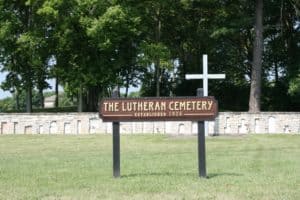 In 1976, we celebrated our 150th anniversary with a series of monthly programs culminating with a sumptuous dinner serving the fare of our 1826 founders. Near one hundred and fifty members attended filling the basement and upstairs. The research work done in preparation for our 150th year brought to light the fact that the very place of our beginnings, the old cemetery on South Hyatt Street, was no longer a part of the life of our church. Sadly, this was true even though it was the final resting place of many of our founders and early members. Investigation proved the gravestones had been vandalized and the location of our first church building was being utilized for growing budded fruit trees. The remaining property was grown up in a tangle of trees and brush. A Cemetery Restoration Committee was formed and work begun to reclaim the propertyand bring it into the province of our congregation. In 1978, a large stainless steel cross was installed thus permanently marking the location of the little log church where our history began. In 1990 a stone wall, eighty-five feet long, was constructed behind the cross. Many of the broken and vandalized head stones were incorporated in the wall as a means of preserving them. The precious place of our beginnings is now and forever rightfully back in the mainstream of our church.